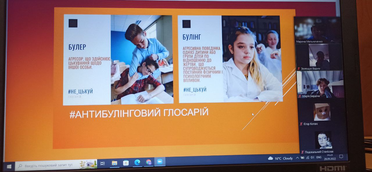 28-30 вересня 2022 року для учнів 7-8 класів було проведено антибулінговий урок "Булінгу - ні". Захід був спрямований на інформування